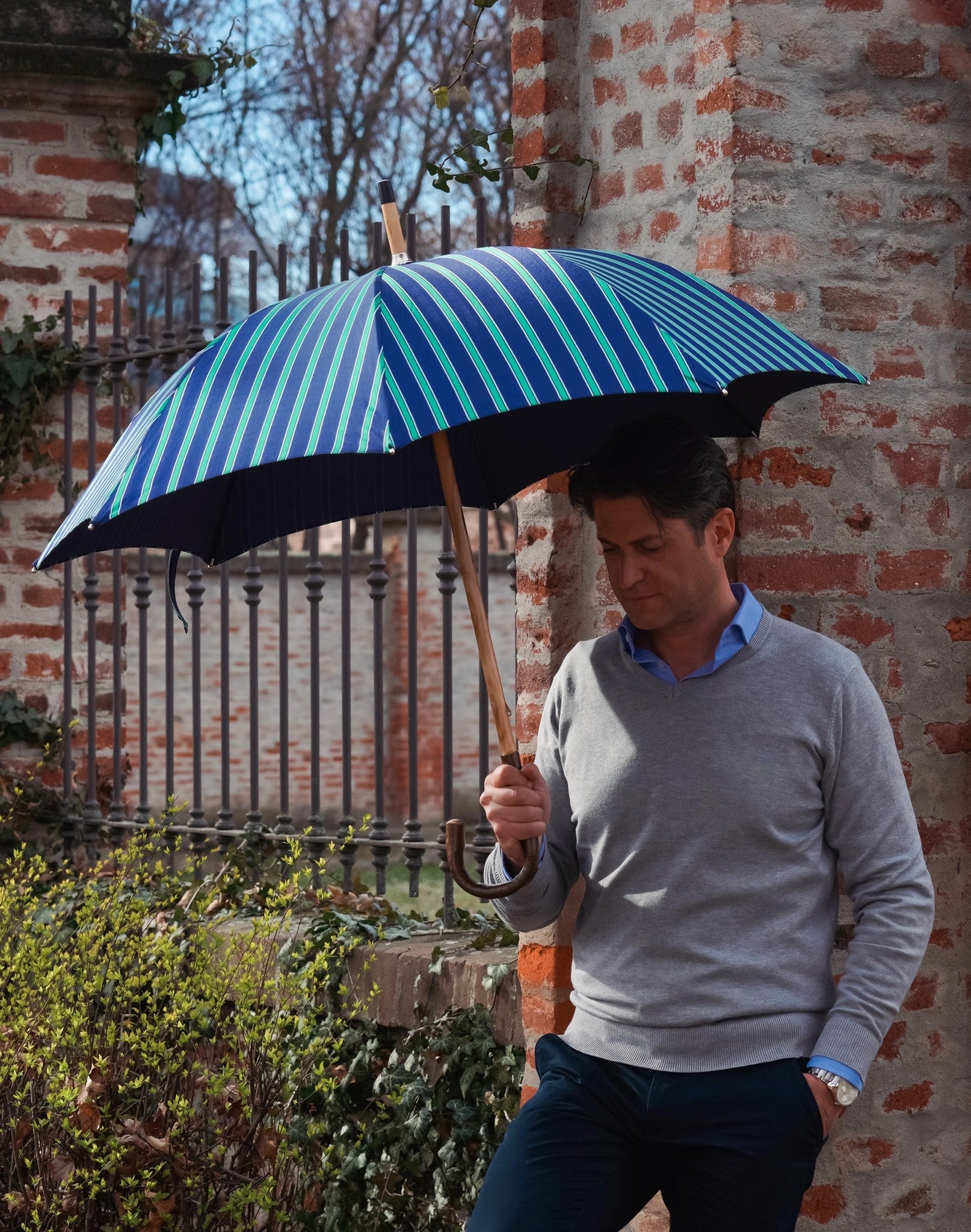 Designed for men who appreciate timeless elegance, this umbrella pairs a polished bamboo handle with a fine beechwood shaft for a truly distinctive look. The dotted jacquard canopy in blue and yellow adds subtle personality while maintaining a refined, formal appearance. Crafted by Italian artisans, it delivers a perfect balance of durability, sophistication, and everyday practicality.